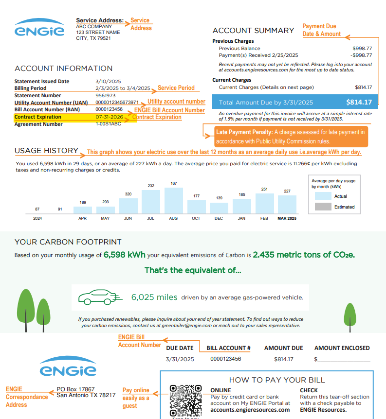 If you receive your invoice from ENGIE, your contract end date is located on your invoice. It is at the top left corner as pictured below.